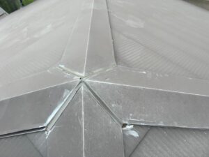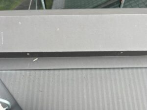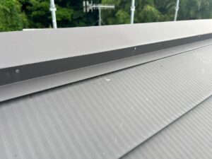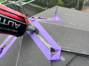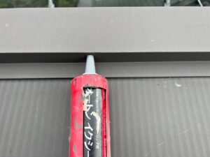 «棟板金の釘が出ているところを釘打ちして、今後釘が出ないよう釘頭をコーキングで押えます»
