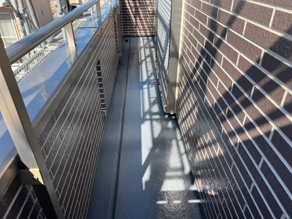 次に、中塗りと上塗りを行い塗膜に厚みを出していきます。ベランダを塗装で保護することで、雨の浸入を防ぐことができ、雨漏りなどの劣化原因から建物を守ることができます。