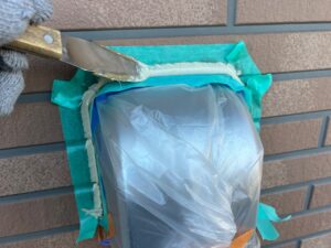 次にコーキング材を注入し、ヘラで均一にならしたら完成です。コーキング処理は、外壁からの雨水の浸入を防いだり地震に対する耐久性を強化する役割があるため重要な工程です。