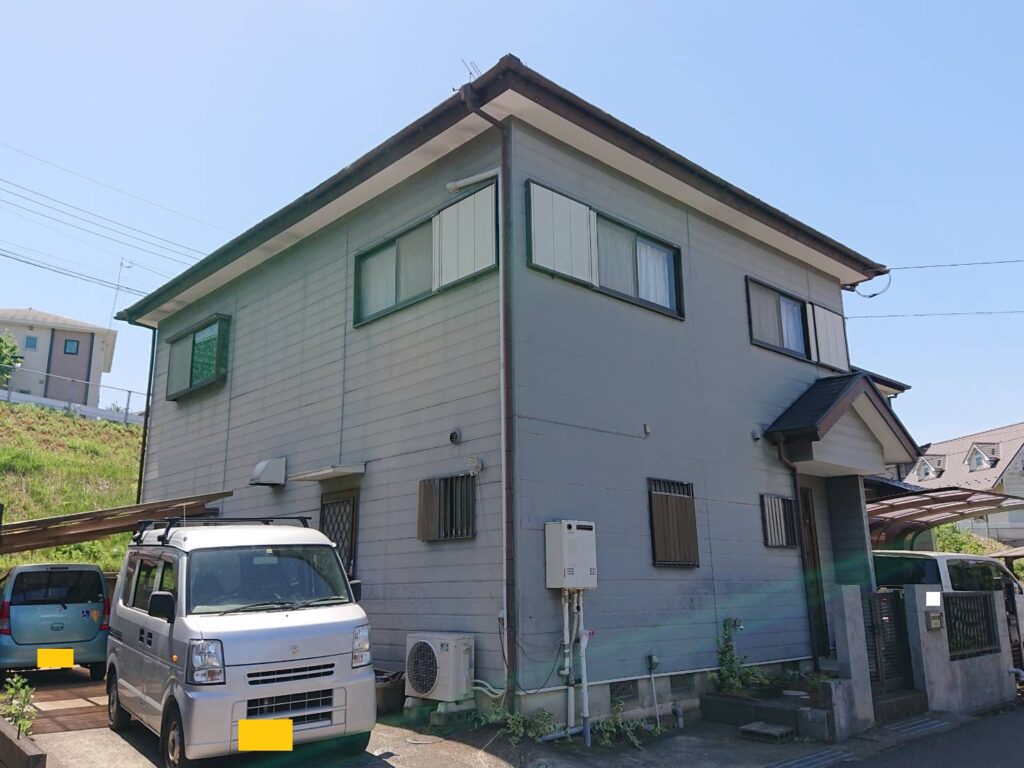 屋根:KFケミカル:KFワールドセラルーフCool 色番号|SC-50 外壁:KFケミカル|KFワールドセラグランツW 色番号|SC-44 外壁クリヤー仕上げ:KFケミカル|KFワールドセラグランツWクリヤー 付帯:KFケミカル|KFワールドセラグランツ 色番号|CC-102(雨戸:SC-23) |