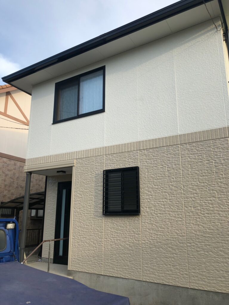 外壁:KFケミカル:KFワールドセラグランツ 色番号|1F:SC-23 2F:SC-09 コーキング:オート化学工業|オートンイクシード 屋根:KFケミカル:KFワールドセラルーフ 色番号|SC-44 付帯:KFケミカル|KFワールドセラグランツ 色番号|CC-107 |